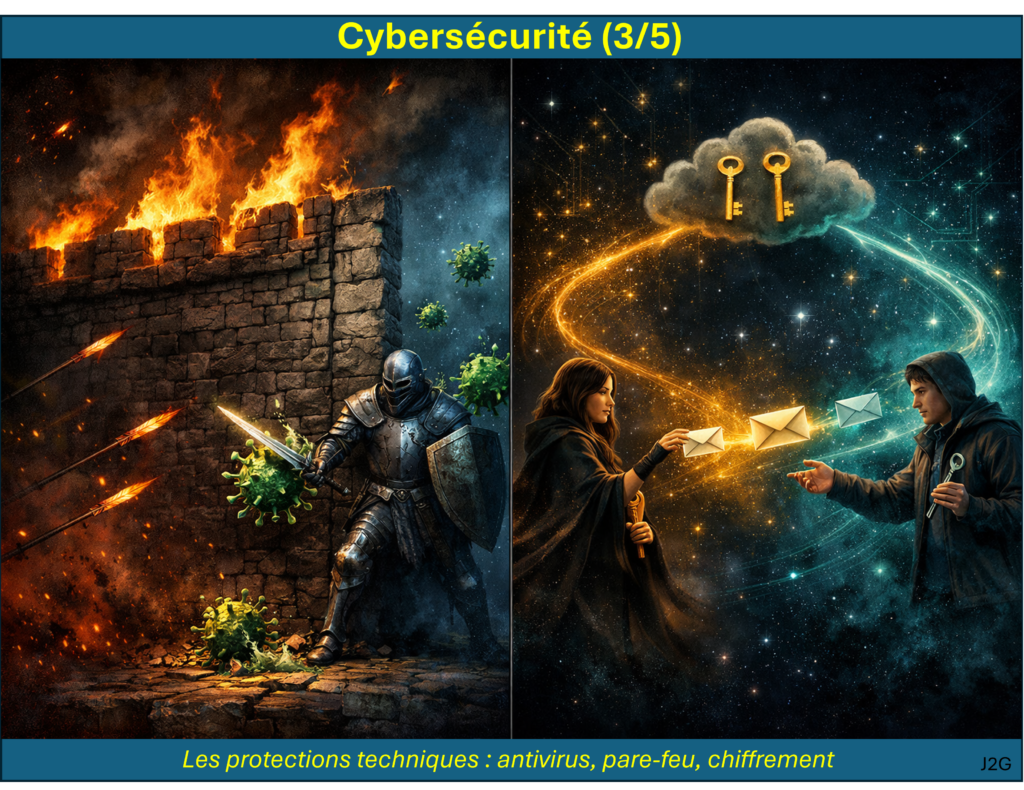 Ensuite, on passe en revue les mesures de protection que les éditeurs de la sécurité informatique ont mis à disposition pour se prémunir de ces attaques (antivirus et pare-feu). En particulier, il faut s’attarder sur l’histoire du chiffrement pour comprendre comment les communications sont actuellement sécurisées (chiffrement RSA). Elles se basent sur un échange de clés asymétriques et le hachage des fichiers transmis. On se projette ensuite dans le futur avec la cryptographie quantique, qui offre un chiffrement sûr, capable d’assurer qu’aucun espion n’a pu avoir accès au message avant réception.