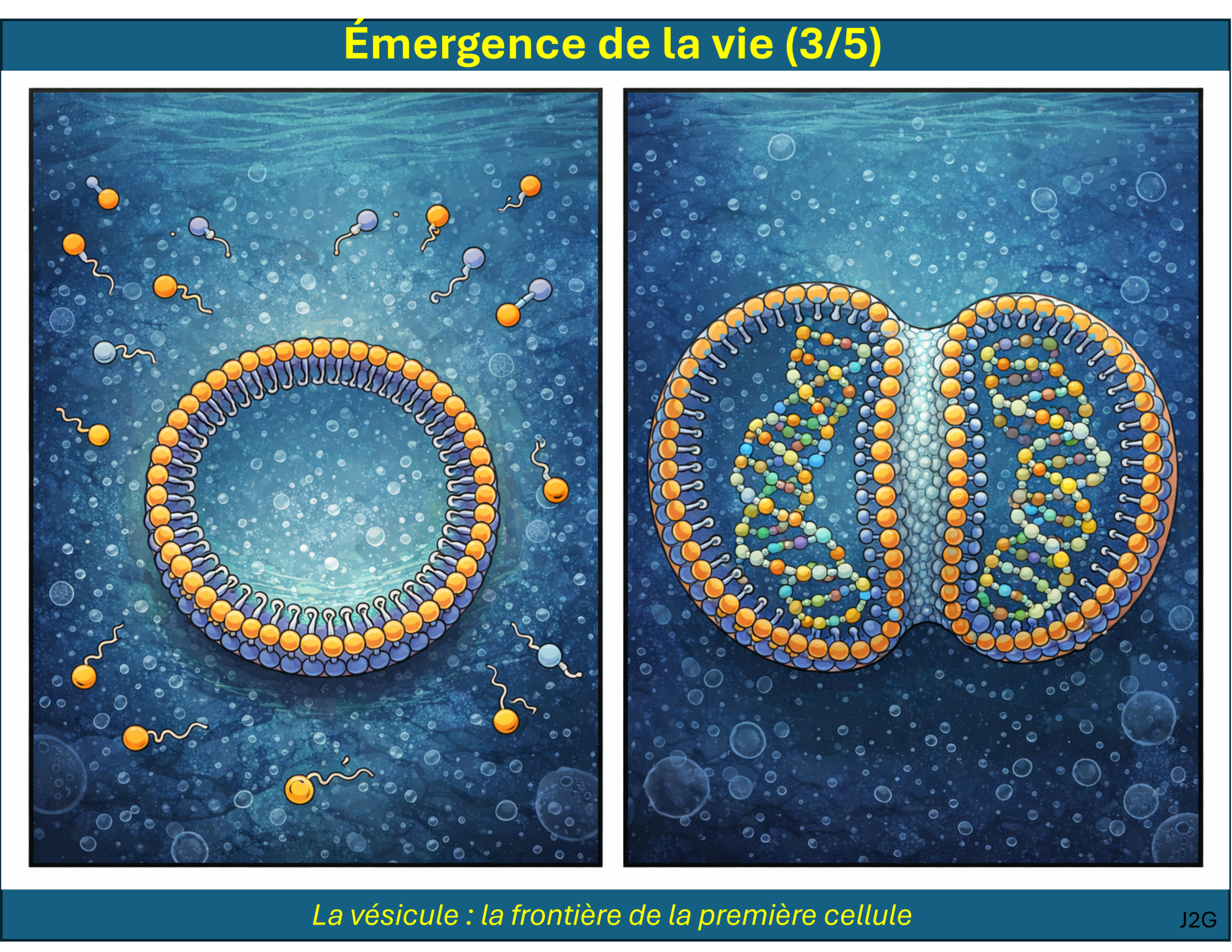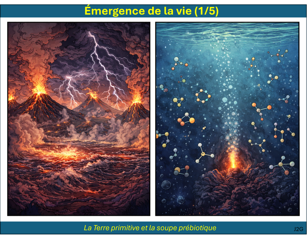 Ci-dessous, une petite BD qui illustre l’émergence de la vie sur Terre, développée dans la conférence.