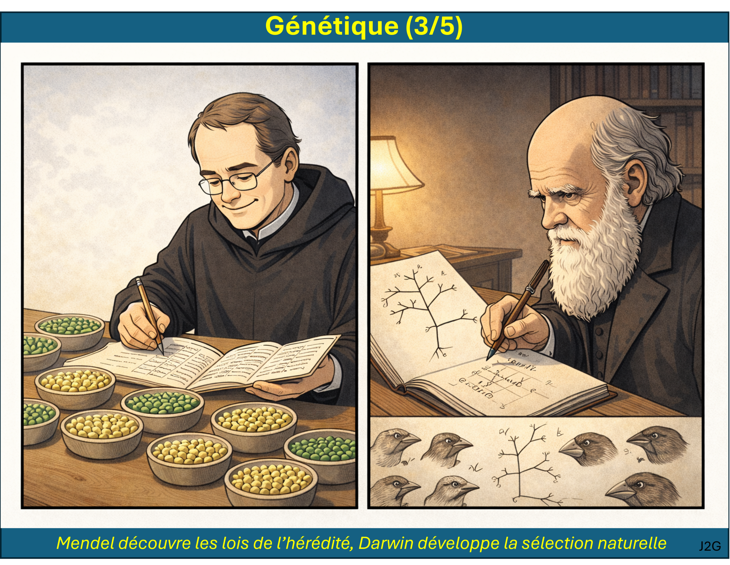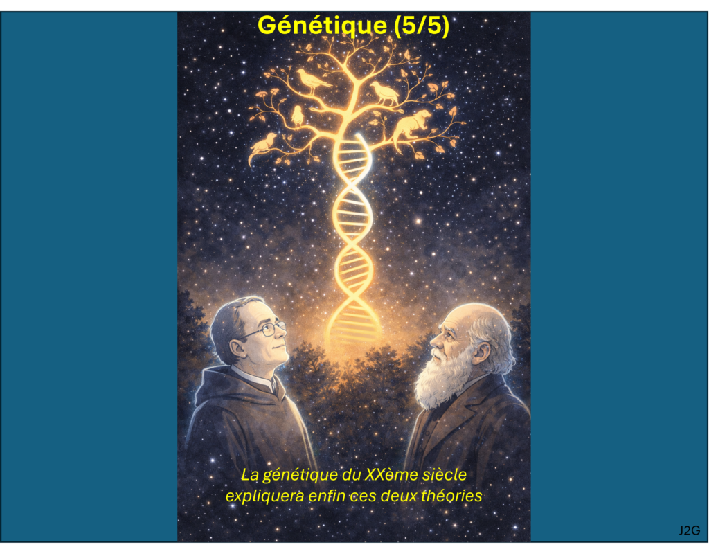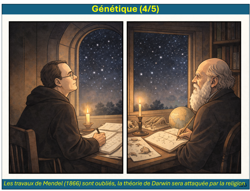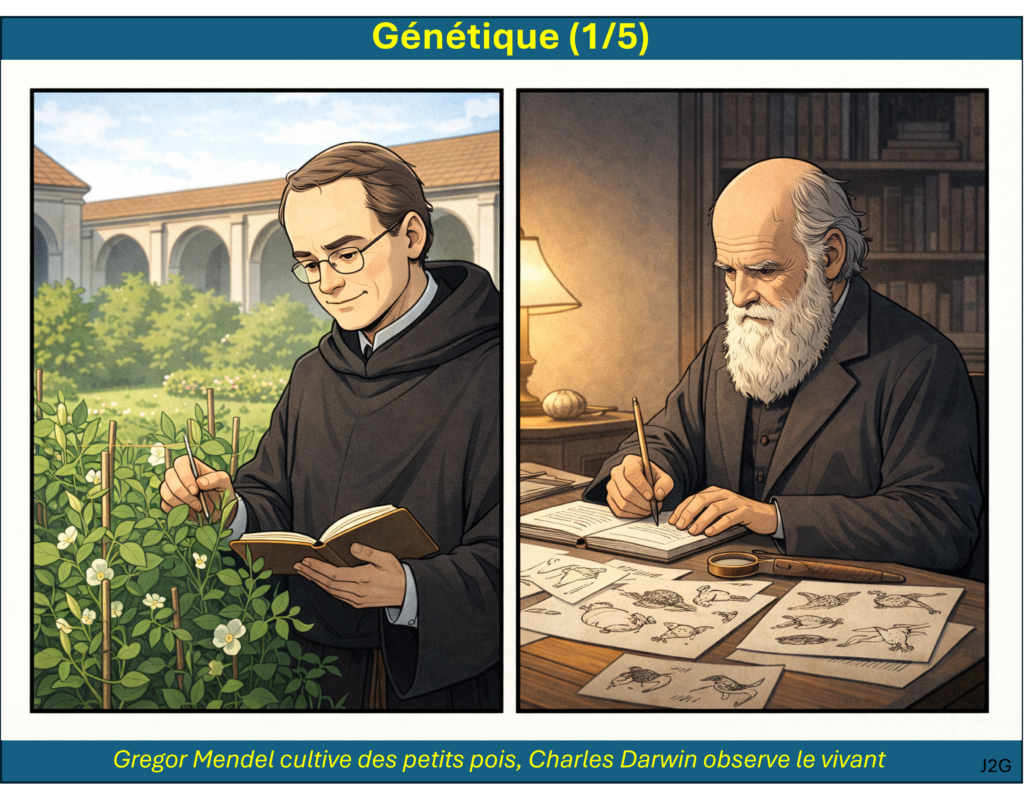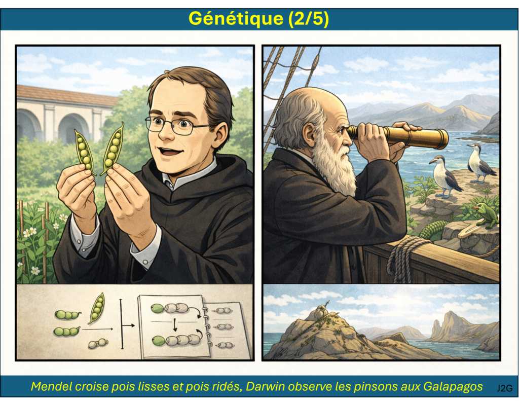 On démarre avec la remise en cause de la théorie du fixisme des espèces par Lamarck et Darwin. On étudie ensuite les principes et les curiosités de la théorie de l’évolution que Charles Darwin a développé toute sa vie. Au même moment, Gregor Mendel énonce les lois de la génétique en cultivant des petits pois, mais Darwin n’aura jamais connaissance des travaux de Mendel.